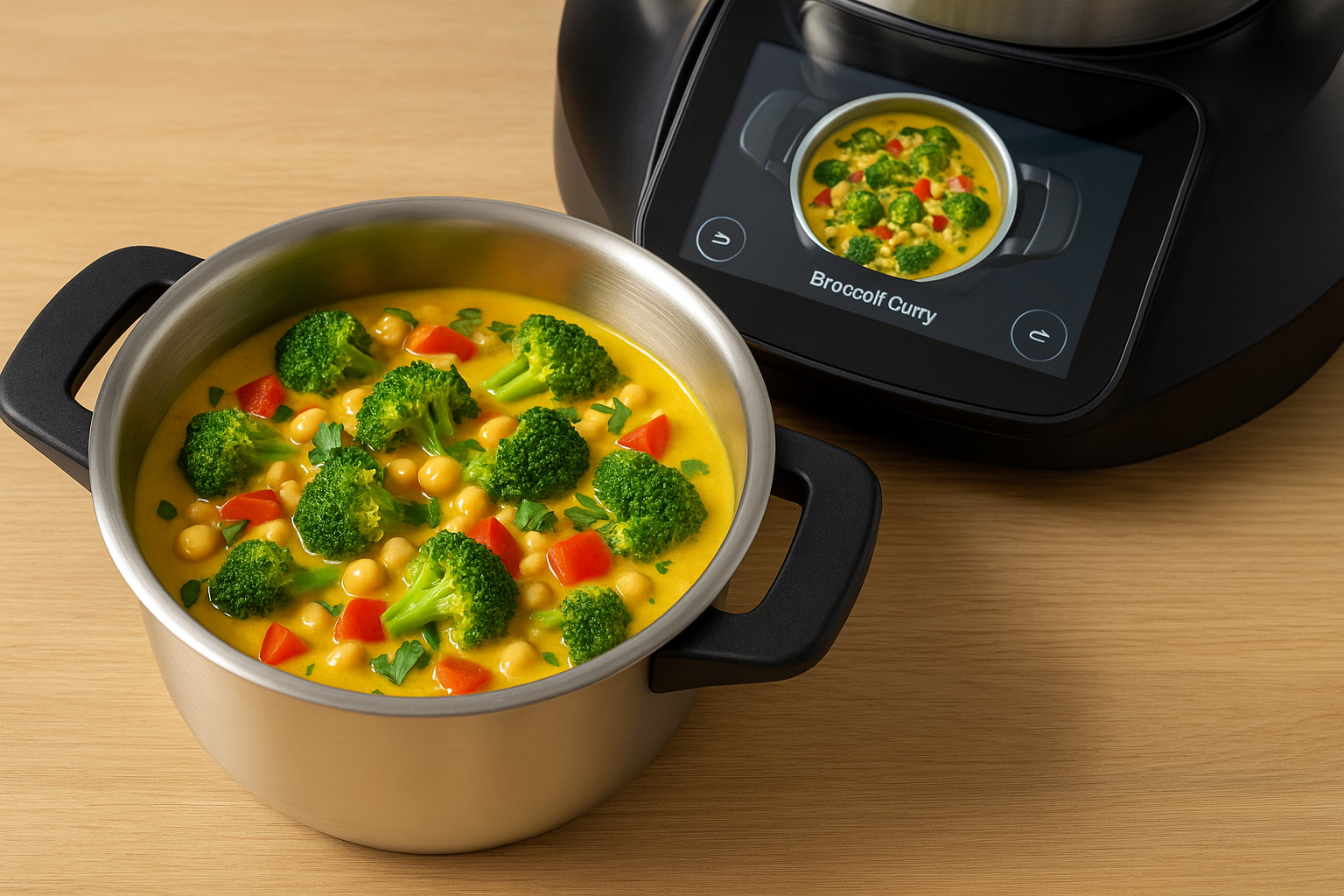 Zutaten (für 4 Portionen): 1 Brokkoli (ca. 400 g), in Röschen geteilt 1 Zwiebel, halbiert 2 Knoblauchzehen 1 Dose Kokosmilch (400 ml) 2 EL gelbe Currypaste 1 EL Öl 1 rote Paprika, gewürfelt 150 g Kichererbsen (vorgekocht) 1 TL Salz ½ TL Pfeffer 1 TL Limettensaft Frischer Koriander oder Petersilie zum Garnieren Zubereitung (im smarten Küchengerät): Zwiebel und Knoblauch in den Mixtopf geben, 5 Sekunden auf Stufe 5 zerkleinern. Öl hinzufügen, 2 Minuten bei 120 °C anbraten. Currypaste zugeben, 30 Sekunden bei 100 °C verrühren. Kokosmilch, Brokkoli, Paprika, Kichererbsen, Salz und Pfeffer einfüllen. 12 Minuten auf 100 °C im Linkslauf garen (Sanftrührstufe). Limettensaft unterrühren, mit Kräutern bestreuen und servieren. Tipp: Dazu passt Basmatireis oder frisches Fladenbrot perfekt!
